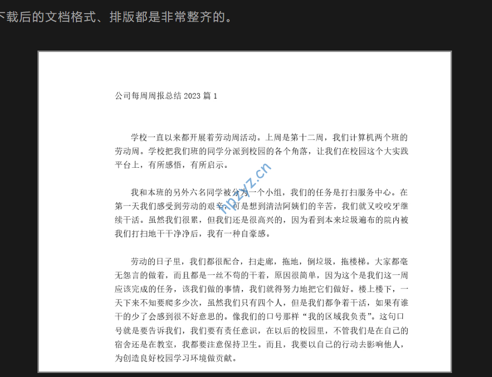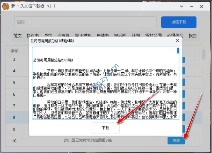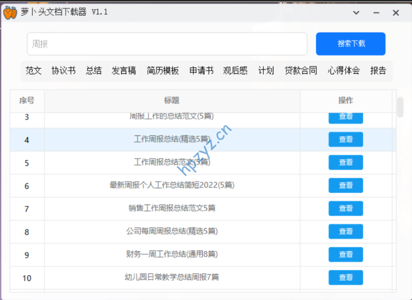 软件解压打开即用,无需注册登录,界面简洁,功能也很简单;软件默认有一些推荐的搜索词,可以选择后,点击搜索直接查找对应文档。当然,你也可以搜索你需要的内容,比如周报等等。点击右边的查看,可以查看文档内容,点击下载可以将文档下载到电脑,默认是放在电脑桌面的。下载后的文档格式、排版都是非常整齐的。总结:软件使用很简单,功能却很强大,最近很多小伙伴需要下载文档,不妨用它试试看。
