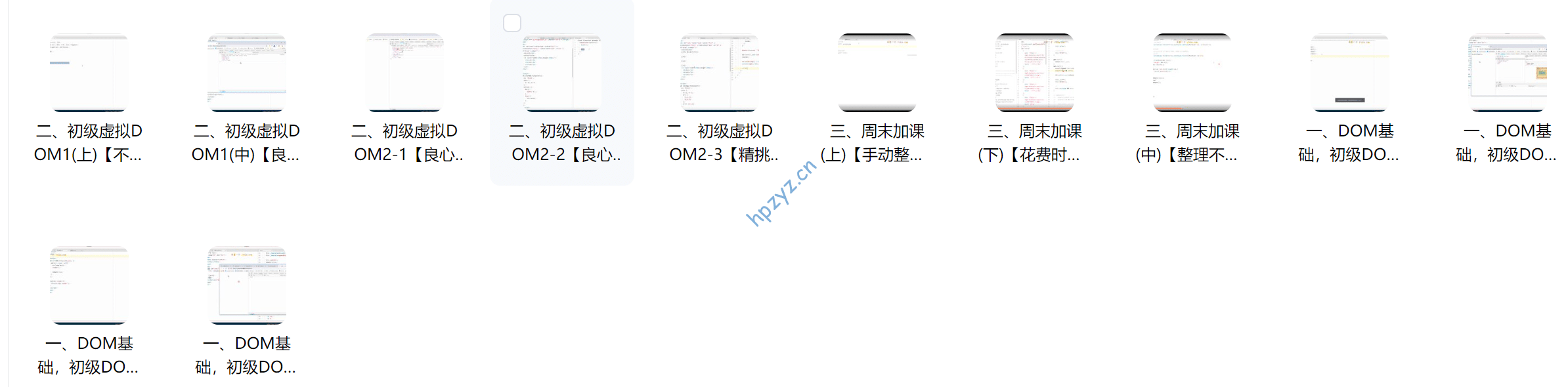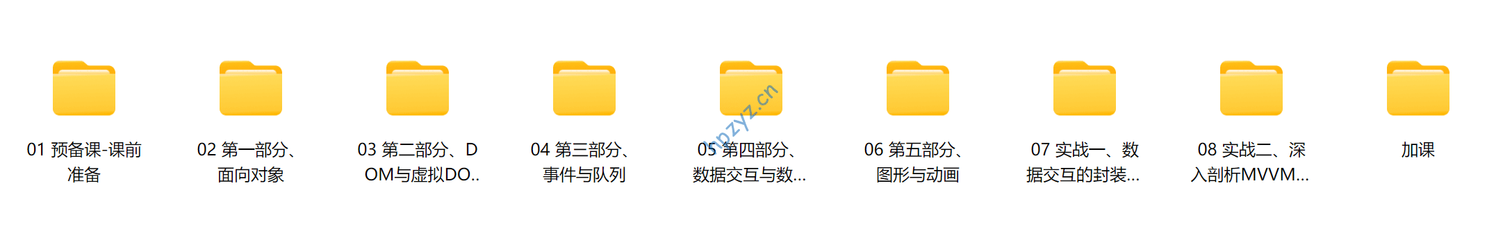课程采用 “基础进阶 + 底层拆解 + 实战落地” 的三段式结构,总资源量达 42.46GB,包含录播视频、源码课件及实战项目文件。核心模块分为 8 大板块: 预备课:涵盖开发环境配置、工具链使用(如 webpack)等前置知识,提供 3 段录播视频(合计约 260MB); 核心理论模块:包含面向对象编程(原型链、继承机制等)、DOM 与虚拟 DOM(含初级虚拟 DOM 实现)、事件与队列(事件派发、异步队列原理)、数据交互(异步操作、axios 封装)、图形与动画(Canvas/SVG 封装、WebSocket 通信)五大技术板块,每个模块配套多段细分视频(单节视频 200MB-1.39GB 不等); 实战项目:两个大型实战案例,分别是 “数据交互的封装与应用”(webpack 项目构建 + axios 核心框架实现)和 “MVVM 框架剖析”(从零实现数据绑定、指令系统、按需渲染等核心功能),配套完整源码与分步讲解视频。